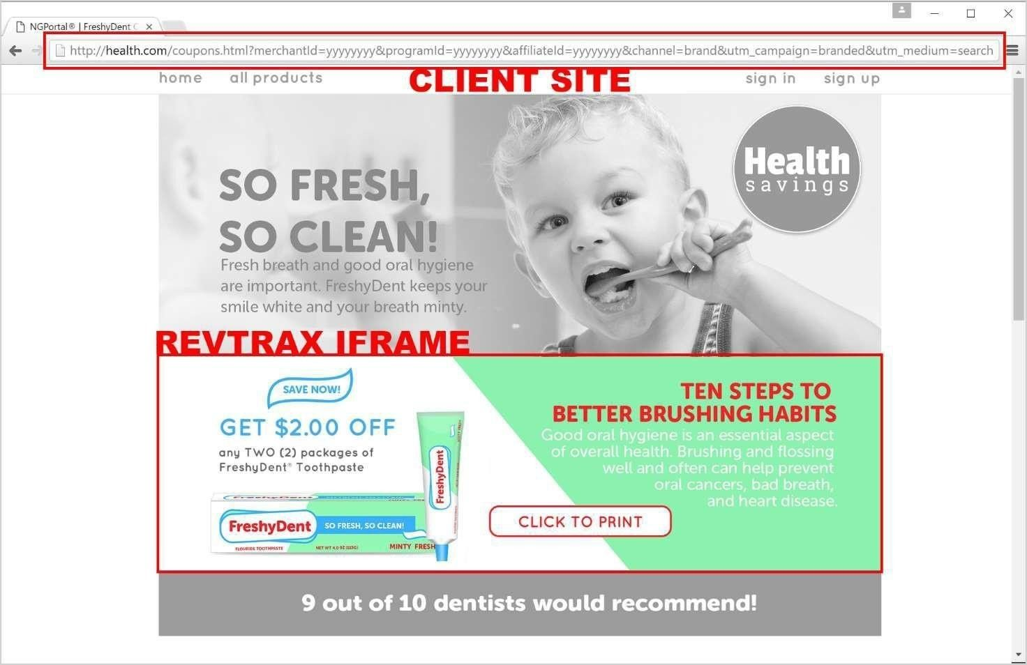 An iframe is a web page within a web page. When used you have complete control over placement and content surrounding the iframe. This creates a branded user experience with a printable coupon within the iframe. When printed, only the coupon is printed. Pages inside the iframe are fully managed by RevTrax without any work by clients.